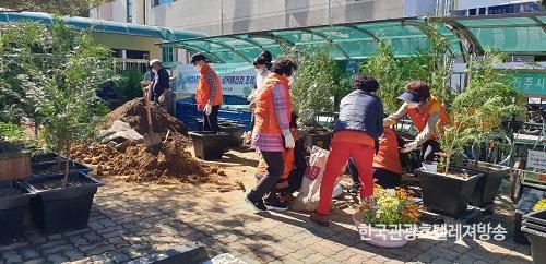 ÁÖ¹ÎÀÚÄ¡À§¿øÈ¸´Â Æí¹é³ª¹« 90±×·ç¿Í ²ÉÀ» È­ºÐ¿¡ ½ÄÀçÇϰí, °ü³» »ó°¡¿Í °ñ¸ñ¿¡ ¹èÄ¡ÇØ ÁֹεéÀÌ Áý ¾Õ °ñ¸ñ±æ¿¡¼­ »óÄèÇÑ °ø±â¸¦ ¸¶½Ç ¼ö ÀÖµµ·Ï Æí¹é³ª¹« °Å¸®¸¦ Á¶¼ºÇß½À´Ï´Ù.