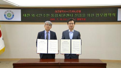 [Çѱ¹°ü±¤È£ÅÚ·¹Á®¹æ¼Û=Áö¿ì¿­ ±âÀÚ] ÇϳªÀºÇà À±¼ø±â ÃæÃ»¿µ¾÷±×·ì ÃѰý´ëÇ¥¿Í ÇãÅÂÁ¤ ´ëÀü½ÃÀåÀÌ ´ëÀü½Ãû ÁßȸÀǽǿ¡¼­ ´ëÀü¿Ü±¹ÀÎÁÖ¹ÎÅëÇÕÁö¿ø¼¾ÅÍ ¼³¸³À» À§ÇÑ »óÈ£Çù·Â ¾÷¹«Çù¾àÀ» ü°áÇß´Ù. ¿Ü±¹ÀÎÁÖ¹ÎÅëÇÕÁö¿ø¼¾ÅÍ ¼³¸³Àº ¹Î¼±7±â ½Ã¹Î°úÀÇ ¾à¼Ó»ç¾÷À¸·Î À¯¡¦